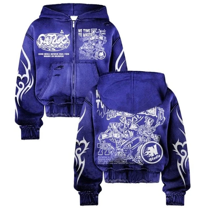 Blue hooded sweatshirt with white graphic prints and text, featuring a zipper front, large pockets, and a drawstring hood, shown from front and back views.